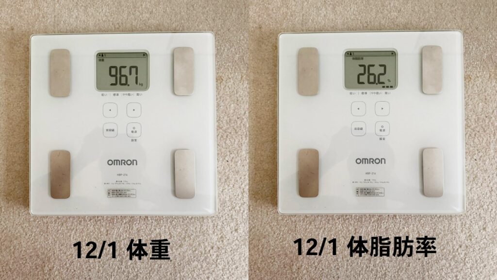 体重測定のルールを決めました。 昨夜(12/1の夕食後)に測った時は97.8kgありましたが、今朝(12/2の起床・排泄後)測ると96.7kgでした。 185cmの身体だと、夕食と水分だけで平気で2kg近く変動します。